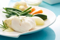 Steamed rosemary scented Cod filet, with spring vegetables and beurre blanc